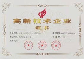 2020年9月9日——河南大張過濾設備有限公司榮獲“高新技術企業”證書